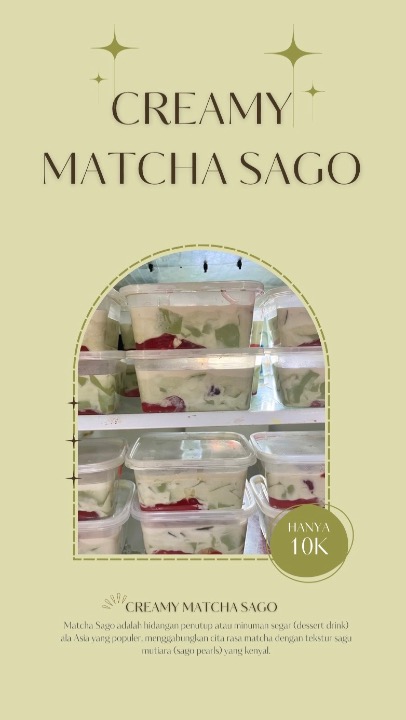 Matcha Sago adalah hidangan penutup yang menyegarkan dan memanjakan, memadukan Rasa Creamy dari Susu uht dan Susu evaporasi dan teh hijau matcha yang khas dengan tekstur kenyal dari sago (sagu mutiara). Selain Sagu mutiara, ada campuran silky pudding matcha dan nutrijel yang sangat memanjakan mulut.